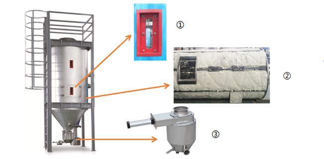 The high temperature air returned from the drying hopper creates a heat sink with the low temperature air that will enter the heating box. The return air is returned from the A2 to the dehumidifier from the A1 through the heat recovery unit. Meanwhile, the dry air enters the heating box from the B2 through the heat recovery unit from B1. The temperature of the returned high temperature air is reduced, and the temperature of the low temperature air entering into the heating box is increased, so as to achieve the purpose of heat recovery and minimizing energy consumption.
